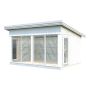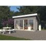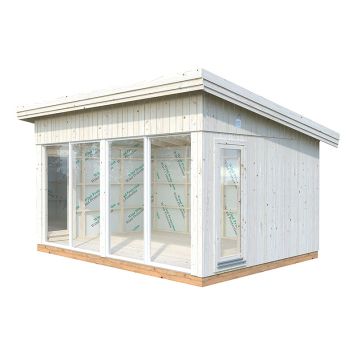 Et moderne anneks med skråtak og doble skyvedører med 5 mm herdet sikkerhetsglass. Annekset har lakkerte aluminiumsprofiler som gir en lett og luftig atmosfære. Den er laget av ferdige veggelementer for enkel montering, levert som byggesett med monteringsutstyr inkludert gulv. Annekset leveres ubehandlet, det anbefales det å behandle/male fritidsboligen umiddelbart etter montering.