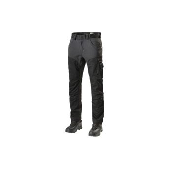 Behagelig bukse i stretch og smalere passform med forbøyde knær. Metalldetaljene er dekket og beskyttet for å forhindre riper på følsomme overflater. Har to frontlommer og to innfelte baklommer. Høyre benlomme har tommestokklomme og pennelommer. Har også en benlomme med utvendig telefonlomme med magnetlås. Kan legges opp med 5 cm.