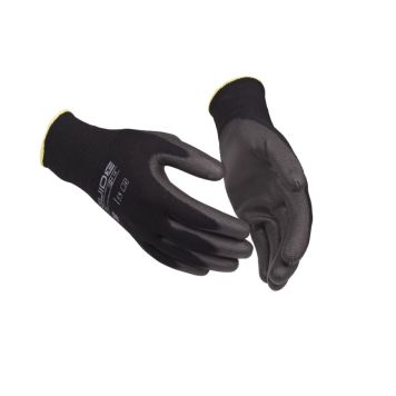 Smidig hanske med berøringsskjermfunksjon. I garnet er det konduktive fibre og hansken er halvdyppet med PU.
