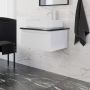 Gjør badet til et sted hvor du føler deg komfortabel. I Skärgård IQ+ finner du de nyeste nordiske designuttrykkene, hvor minimalisme møter et industrielt preg. Underskapet har myktlukkende skuff og kommer med smarte skuffedeler i trendy antrasitt. Fronten er pent integrert i det moderne hvite matte designet. Benkeplaten i lekker blank svart design har forborede hull slik at du enkelt kan montere den frittstående servanten og kranen. Kombiner møblene dine med en praktisk metallhylle og ikke glem å komplettere møblene med et speil eller speilskap.