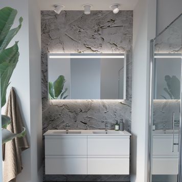 Velg mellom 8 forskjellige modeller av speil og speilskap. Opplyste speil kommer med sensorstyrt belysning. (gjelder ikke Stone). Du finner f.eks. dobbeltsidige speil med 165 graders hengsler, LED-belysning over, under og i skap og 230 V stikkontakt med bryter.