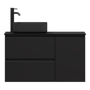 Komplett baderomsmøbel som inneholder frittstående overliggende moderne servant i matt sort underskap sammen med sideskap med mattlakkerte skuffefronter gjør dette til et unikt og stilrent design. Benkeplaten har en stilig og praktisk design laget av det sterke materialet Compact Melamin.