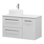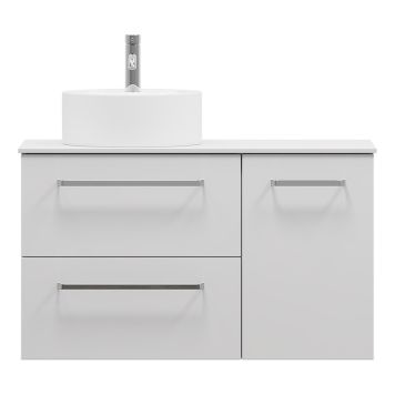 Komplett baderomsmøbel inkludert frittstående overliggende porselensservant, underskap sammen med sideskap med mattlakkerte skuffefronter gjør dette til et unikt og stilig design. Benkeplaten har en stilig og praktisk design laget av det sterke materialet Compact Melamin.