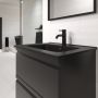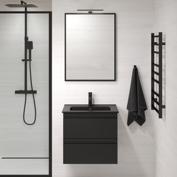 Komplett baderomsmøbel som inneholder en moderne tynnere porselensservant, et sort matt underskap ...