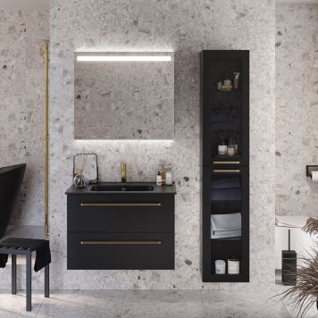 Komplett baderomsmøbel som inneholder en moderne tynnere porselensservant, et sort matt unders...