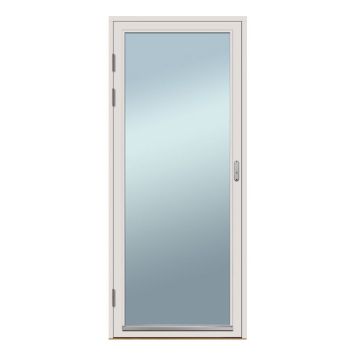 Hvit balkongdør med helglass. Størrelse 8x20, venstrehengt. Dørene kommer med notspor i karmene i henhold til norsk standard.