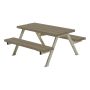 Komplett hagemøbel passende for barn med bord og benker av gråbrunt malt treverk og rammeverk i varmegalvanisert metall.
