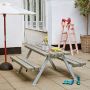 Komplett hagemøbel passende for barn med bord og benker av gråbrunt malt treverk og rammeverk i ...