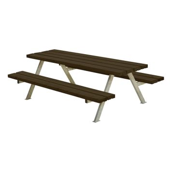 Komplett hagemøbel egnet for barn med bord og benker. Malt treverk i svart kulør og rammeverk i varmegalvanisert metall.