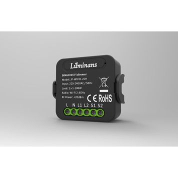Med 2-kanals boksdimmeren Bingo Wi-Fi/BLE fra Luminans kan du manøvrere dine lamper hvor du enn er. Styr dine LED, lavenergi lamper, lyspærer, lysrør og halogenlamper trådløst via appen Tuya Smart på din mobil eller nettbrett uten å behøve være tilkoblet samme Wi-Fi-nettverk. For ytterligere komfort kan du med fordel tilkoble stemmeassistenter som Amazon Alexa eller Google Assistant.