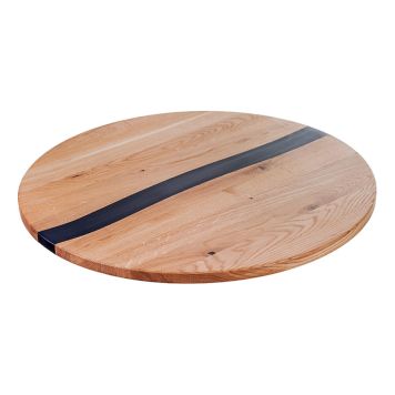 Denne runde bordplaten er en harmonisk kombinasjon av eik og polyuretan, noe som gir den en unik og moderne design. Bordplaten er laget av massivt eiketre og det miljøvennlige alternativet polyuretan i stedet for epoksyharpiks. Den svarte polyuretanen skaper en stilig kontrast mot det naturlige treet og har en overflatebehandling som er dekket med en naturlig voksolje som gir en varm og myk følelse. De elegante sveitsiske avrundede kantene gir et sofistikert utseende som gjør det perfekt til bruk som bordplate eller salongbord.