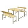 Settet inneholder et bord og to benker med ryggstøtte. På både bord og benker er plankene laget av trykkbehandlet tre, mens den robuste rammen er laget av varmgalvanisert stål.