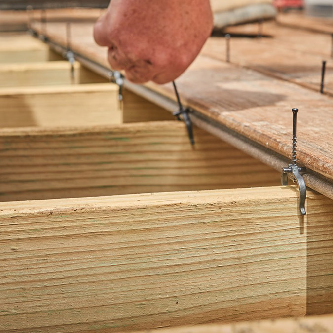 - Spesialdesignet skrue for skjult innfesting som forsenkes uten å sprekke terrasserbordene