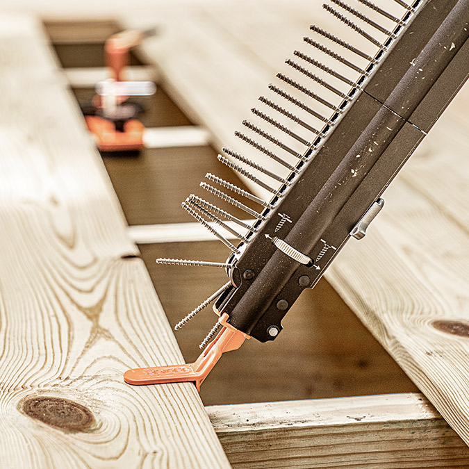 Kan brukes til tre forskjellige innfestningsmetoder; båndet terrasseskruer for både skjult montering og klassisk montering, og klips for skjult innfesting av sporfrest kompositt- og trebord.