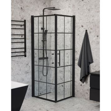 Gi badet ditt en trendy og stilig detalj med dette dusjhjørnet. Dusjhjørnet inneholder fast vegg og dør. Plasseringen av døren kan velges fritt under montering. Glasset er laget av 6 mm NANO-behandlet herdet sikkerhetsglass med en sjenerøs høyde på 198 cm. Nanobehandlingen gjør det mye lettere å holde glasset rent og smuss fester seg ikke like lett. Utsiden av glassene er belagt med et silketrykk som imiterer sprosser.