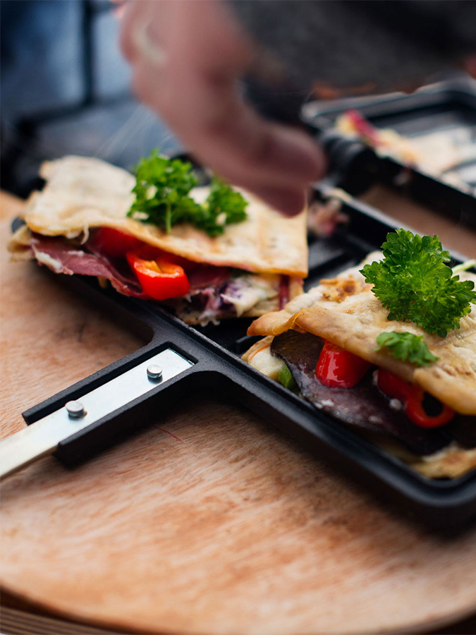 Tilberedelse: Smør pestoen på brødskivene. Tilsett skivet mozzarella, skivet tomat og lufttørket skinke. Legg toasten i toastjernet og legg jernet over bålet til osten har smeltet og brødet har blitt gyllent.
