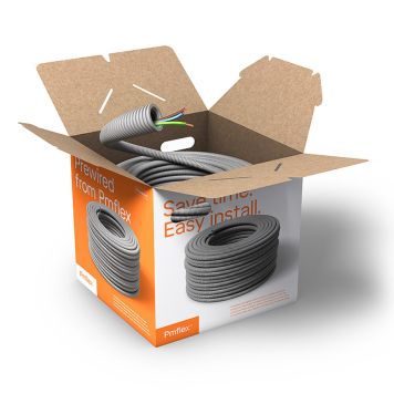 PM Flex Zero er en praktisk og pålitelig installasjonskabel ferdig trukket i et fleksibelt plastrør. Leveres en i eske med forhåndstrukket 3X1,5mm2 FK kabel.
