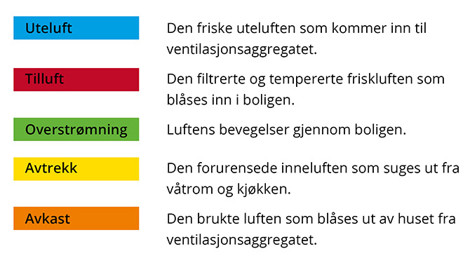 Her er fargekodene som beskriver luftens vei i ditt hus.