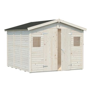 Redskapsbod Dan i ubehandlet nordisk gran 7,6 M² Dan er en romslig og rimelig bod som finnes i flere ulike størrelser, fra den minste på 4,6 m2 til en ekte to-roms bod på totalt 14,2 m2. Perfekt oppbevaring av hageredskaper, hagemøbler, sykler og andre sesongbaserte redskaper som krever trygg og beskyttet oppbevaring. Den doble døren gjør det enkelt å ta inn og ut selv store verktøy. Med flotte vinduer har boden et koselig uttrykk som med riktig fargeskala vil passe perfekt inn i hagen din.