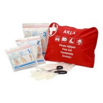 Basert på 1-2-3-systemet, poser med tydelige instruksjoner. Innholdet er tilpasset skadens art. RASKT-TRYGT-ENKELT. Puten er produsert i rød oxfordnylon og har målene: 29x20x7 cm