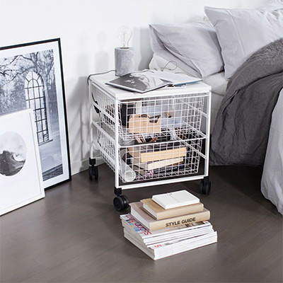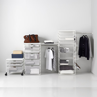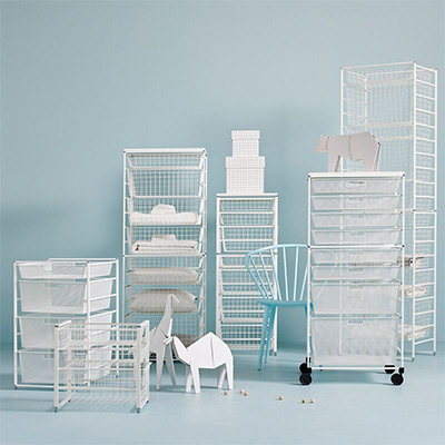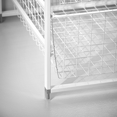 Dette er et gulvstående system som er bygget med gavelsider, tverrstager og kurver. Dette passer utmerket å plassere i for eksempel garderoben eller på vaskerommet, frittstående eller på hjul. Du kan kombinere kurvstativer med forskjellige høyder for å lage en oppbevaring som passer under for eksempel trapper eller skråtak. Kurvene kan også monteres i tradisjonelle garderober og skap ved hjelp av glidelister som er skrudd fast på sidene i garderobestammen.