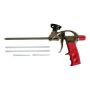 Monter beholderen i pistolen og reguler deretter med håndtaket hvor mye skum som skal slippes ut. Skumpistolen leveres med flere forskjellige dyser, slik at selv trange og vanskelig tilgjengelige steder kan nås. Pistolen er laget av presstøpt sink, noe som gir den lav vekt og lang holdbarhet.