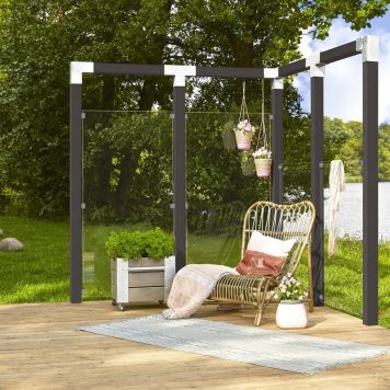 Glasselement som sammen med stolper gir et gjerde som rammer inn både terrasse og uteplass uten å stenge for sol eller ...