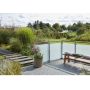 Glasselement som sammen med limtrestolper gir et gjerde som på en stilig måte rammer inn både terrasse og uteplass uten å stenge ute solen eller utsikten. Glassgjerdet er laget av 8 mm herdet glass og leveres inkludert 4 festeanordninger for montering.