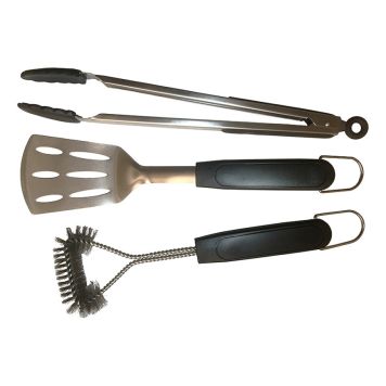 Dette verktøysettet inneholder en tang, en grillspade og en grillbørste. Tangen er utmerket for å gripe og snu maten med. Grillspaden er ideell hvis du vil snu hamburgere eller annet. Avslutt deretter grillingen ved å enkelt rengjøre ristene med den effektive grillbørsten. Verktøyene er laget av robust rustfritt stål og har et mykt varmeavvisende håndtak. Alle verktøyene er utstyrt med krok slik at du enkelt kan henge opp verktøyene dine på siden av grillen og alltid ha dem for hånden.