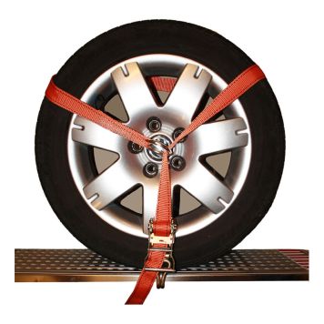 Lastestropp som har en krok og et bånd med en åpen ende, den andre med ring. Båndet trekkes rundt dekket, gjennom ringen ...