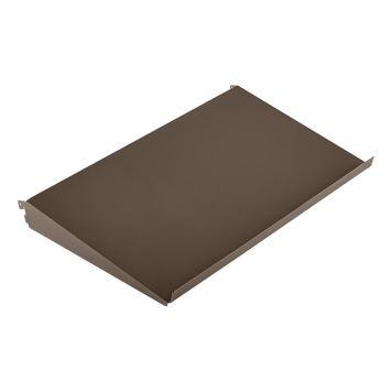 Vinklet metallhylle med opphøyet kant foran og integrerte fester for Hengeskinne. Passer til oppbevaring av sk...