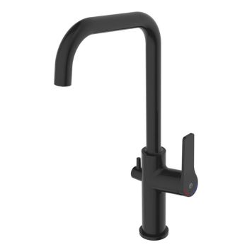 Et kjøkkenbatteri med høy kran i tidløst og harmonisk design. Armaturen har en justerba...