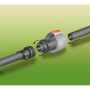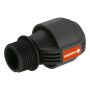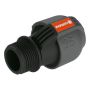25 mm x 1” hann-gjenger. Med koblingen kan vanningssystemet kobles direkte til boligens vannforsyning. Takket være den patenterte koblingsteknologien, kan montering eller demontering av røret utføres uten verktøy, ganske enkelt ved å dreie skruekoblingen 140° For vanntett og sikker bruk er gjengene på koblingen selvtettende.
