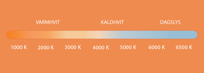 Kelvin (K) forteller noe om lyskildens fargetemperatur. En lav verdi gir et varmt lys og en høy verdi gir et kaldt lys.