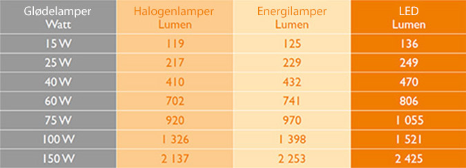 Watt (W) er et mål på effekten på lyskilden og sier ingenting om lysmengden på lyskilden. Sammenligne watt med ulike teknikker sier ingenting om hvor mye lys du får, mem bare hvordan effekten ser ut produktene i mellom.