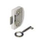 En flat utenpåliggende lås i plast. Fungerer som stativ for både høyre og venstre. Nøkkelhullet er plassert 30mm fra kanten og kommer med en matchende nøkkel.