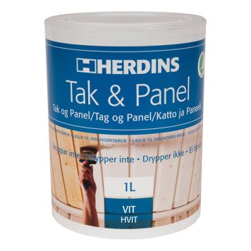 Herdins Tak & Panel er en miljøvennlig vannbåren og dryppfri lasur for ubehandlet eller tidligere lakkerte bartre innendørs- Den forebygger og reduserer gulning og kvistblødning. Produktet gir din gamle og gulnede panel en vakker lys og silkematt overflate. Den er lett å stryke ut, og de dryppfrie egenskapene gjør det til et populært produkt, spesielt for takmaling, som fagfolk setter pris på som hjemmefiksere.