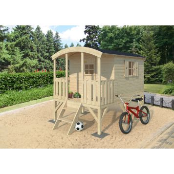 Lekestue Huck fra Palmako har et unikt utseende som definitivt vil gjøre inntrykk på barnet ditt. Denne koselige lille hytta minner om en sirkusvogn, med vinduslemmer og en veranda som åpner opp for mye fantasifull lek. Det avrundede taket skaper en koselig krypkjeller og den hevede konstruksjonen på søyler gjør lekehuset ekstra spennende. Passer for barn over 3 år. Den barnevennlige og sikre konstruksjonen har pleksiglassvinduer og klemfrie dører. Lekehuset leveres i ferdige veggelementer med stenderverk og stående panel. Du bygger enkelt lekehuset på en enkelt dag. Alle Palmako lekehus er TÜV-sertifisert og CE-merket.