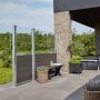 Leveggen Futura takler det skiftende skandinaviske været og er helt vedlikeholdsfri. Gjerdet består av brede planker i skifergrå kompositt, noe som gir et tett gjerde som garanterer ly og privatliv. Vindskjermen har en glasskive på toppen slik at du kan nyte en vakker utsikt eller hage samtidig som den beskytter mot vinden.