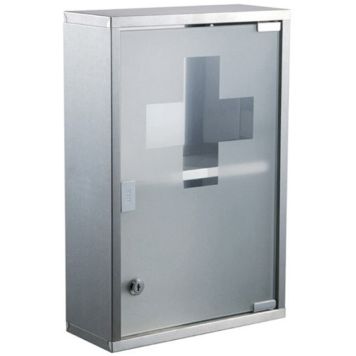 Låsbart medisinskap med en frostet skapdør.