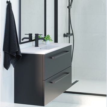 Velg mellom fargene hvit, hvit høyblank, grå eller svart. Underskapet har myktlukkende skuffer i metall, skuffeinnsats av akryl i den øverste skuffen og myke plastmatter i begge skuffene som forenkler rengjøringen.
