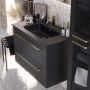 Velg mellom fargene hvit, hvit høyblank, grå eller svart. Underskapet har myktlukkende skuffer i metall, skuffeinnsats av akryl i den øverste skuffen og myke plastmatter i begge skuffene som forenkler rengjøringen.