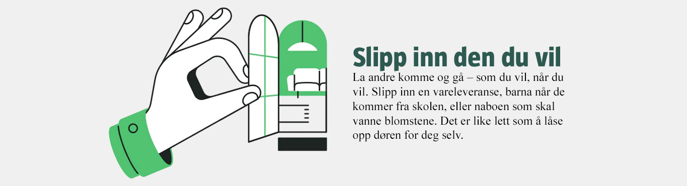 Vi ønsker at det skal være enkelt å reise hjemmefra og fortsatt ha kontroll over døren selv når du ikke er hjemme – og det skal være hyggelig å komme hjem. Slipp inn naboen, barna, bestefar eller håndverkeren med mobilen når du trenger det.