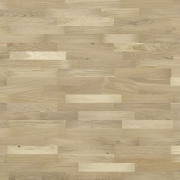 Eik parkett 3-stav behandlet med matt lakk i en trendy hvit fargetone. Det lyse gulvet gjør at rommet føles større og luftigere. Takket være 5G-systemet er gulvet veldig lett å legge.