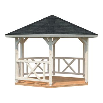 Åpen paviljong Betty med en klassisk form er den perfekte paviljongen for enda mer komfort i hagen din. Med sin solide konstruksjon og klassiske uttrykk er Betty en perfekt måte å samle sine kjære på. Betty fungerer som en praktisk uteplass som du enkelt kan plassere på eiendommen din. Den åpne paviljongen har et robust tak og er formet som en sekskant, som minner om et typisk lysthus. Paviljongen er omkranset av et klassisk tverrrekkverk og blir en komplett deilig uteplass hvor taket beskytter mot for mye sol.
