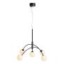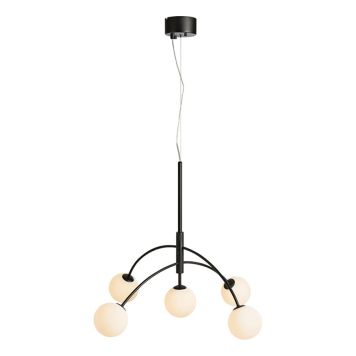 Stilig takpendel med metall ramme og fem hvite glass lampeskjermer. Dette er en lampe som tiltrekker seg oppmerksomhet og passer godt over spisebordet eller andre steder i hjemmet. Lampen monteres med takkrok. Takkontakt følger ikke med.