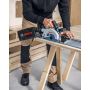Dette er en kraftig sag for maksimal presisjon, kompatibilitet med styreskinne og kapskinne. En sag som i praksis er tre sager i en. Gjør sirkelsagen til en mobil og kompakt gjærsag ved enkel tilkobling til styreskinne FSN X. Bruk sirkelsagen som en vanlig sirkelsag med eller uten skinne, eller bruk sirkelsagen som en senkesag med eller uten skinne. Kompakt design med åpen bunnplate muliggjør minimal avstand mellom sag og vegg.