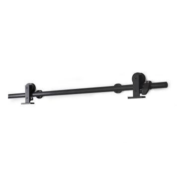 Komplett skyvedørsbeslag av svartlakkert stål til veggmontering. Like enkel å montere for hobbysnekkere som proffe...