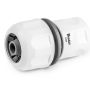 En universal kobling med klikkfunksjon og STOPP produsert i PVC av høy kvalitet som enkelt lar deg å koble en slange med en kran, munnstykke eller kanskje vannspreder uavhengig av slangedimensjon. Med STOPP blir det enkelt å bytte munnstykke eller tilbehør, ettersom det ikke kommer vann så lenge det ikke er tilbehør tilkoblet slangen. Koblingen har godt profilerte tenner som sikrer stabil bruk.