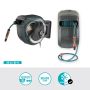 Praktisk slangetrommel som du monterer på veggen og ruller opp vannslangen i. Med den innovative opprullingsteknikken rulles hageslangen opp på null tid og du slipper dermed bryderi med brettede eller vridde slanger. Når du skal bruke vannslangen, trekker du den enkelt ut og den låses automatisk ved ønsket lengde takket være spesielt korte låsepunkter. Med en lett trekk løsner låsen og den integrerte fjæren trekker automatisk inn slangen igjen. Den integrerte slangeledningen sikrer at slangen rulles inn på en sikker og kontrollert måte.
